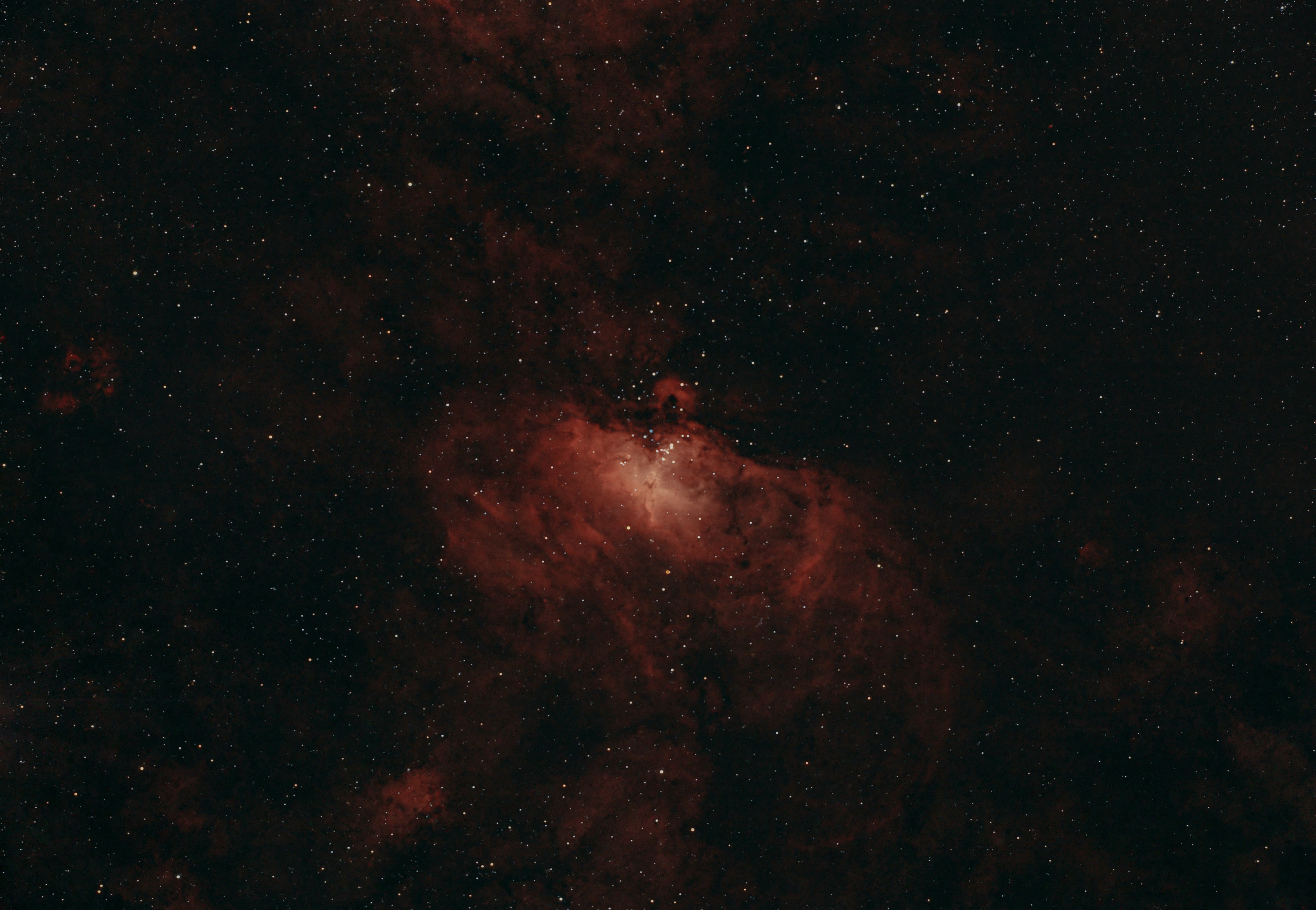 - Sulfur – Deep Red. This often blends with hydrogen’s red glow. Example: Many emission nebulae, like the Eagle Nebula (M16), have reddish areas from sulfur.