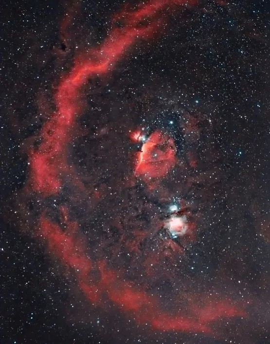 Barnard’s Loop is a vast, glowing arc of hot gas within the Orion constellation. It is part of the Orion molecular cloud complex, which also includes the Orion Nebula and the Horsehead Nebula. Spanning more than 10 degrees across Orion, this massive nebula glows primarily in Hydrogen-alpha light, illuminated by ultraviolet radiation from young, hot stars. Although classified as an emission nebula, research suggests it likely formed from a supernova explosion between 2 and 4 million years ago.