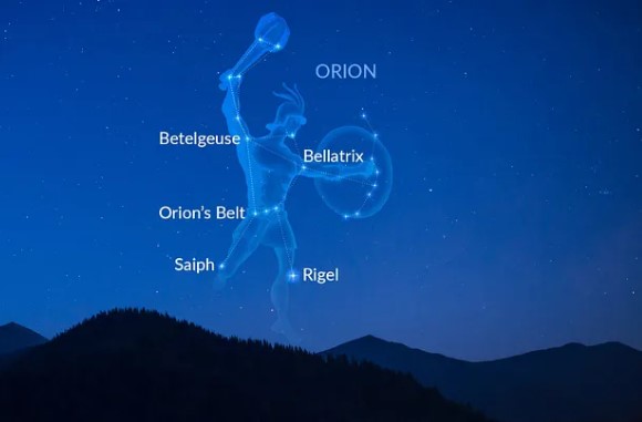 The constellation Orion is easily recognizable by its distinct shape, formed in part by four prominent stars: Rigel, Betelgeuse, Bellatrix, and Saiph. These stars outline Orion’s shoulders and feet, creating a roughly rectangular frame. Orion is home to two of the ten brightest stars in the night sky—Rigel and Betelgeuse.